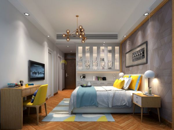 男孩房运用了丰富的色彩搭配,展现着一股蓬勃的朝气,和现代审美的气息。卧室延续平板装饰线的天花设计,多层次的灯光组合,既能满足日常生活照明的需求,在造型上也体现中式风格的古色古香。