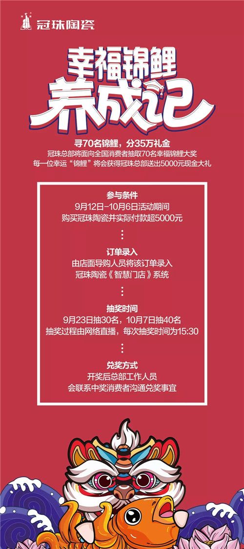 目前,冠珠陶瓷“幸福锦鲤节”活动在终端还在如火如荼地进行当中,有购砖需求的业主敬请把握良机,选择冠珠,下一个幸福锦鲤可能就是您!让我们10月7日,下一次抽奖现场再见!