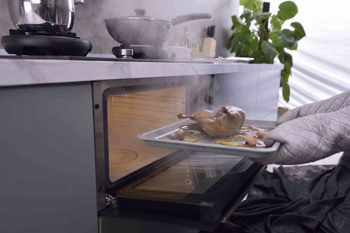 方太灶蒸烤烹饪机的蒸汽又大又猛,温度控制精准,加热盘也比其他烤箱大得多,给下厨的人留下更多的空间,恰逢家里来客人时,也不会发生菜量不够又再蒸一次的尴尬场面。还可以开辟新的做法,烤鸡的肉质可能比较干硬,先烤后蒸或先蒸后烤可达到表里熟透、肉骨分离、口感润滑的效果。
