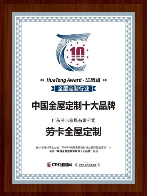 在由中华建材网主办的首届“华腾杯”2019中国家居建材行业品牌征选活动中,各大全屋定制品牌积极参与,通过这一次真正的实力较量,在经过激烈的网络投票比拼、专家评审与组委会定向考评三项综合评定后,最终劳卡全屋定制凭借强大的品牌实力以及良好的市场口碑赢得了“中国全屋定制影响力十大品牌”。
