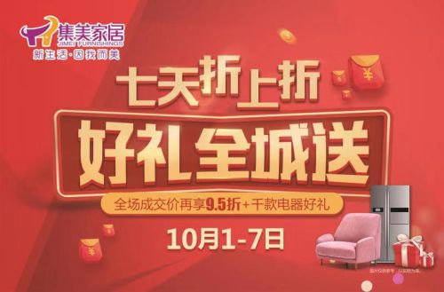 恰逢新中国成立70周年之际,消费者不但可以享受国庆节七天的快乐假期,更有集美家居北京四店联动“七天折上折,好礼全城送”全场成交价再享9.5折活动惊爆来袭。