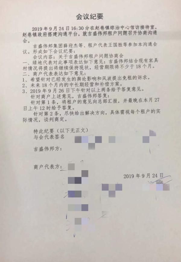 关于会议上租户提出的需求,吉盛伟邦没有当场给出明确答复,但承诺会将商户的免租要求向总部汇报,且最晚9月27日12时给予答复。而关于补偿方案,吉盛伟邦表示需要针对每个租户的具体情况,通过谈判商定。