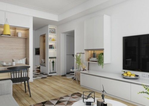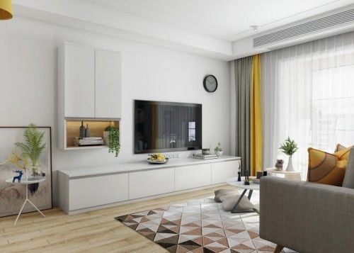 如果说餐厅是家里的功能担当,那么客厅一定就是颜值担当。好莱客设计师在客厅采用简白花色的地柜+吊柜设计,左右不对称结构,打破中规中矩的柜体造型,空间趣味性大提升。浅木色的地板搭配网红拼色地毯,灰色布艺沙发加以亮色抱枕点缀,简约又不失温馨感,简直是二人小窝的标配。