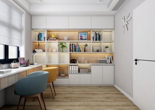 业主家有大量与工作相关的书籍,刚好可以让书房成为它们的归宿。打造整墙的收纳柜,储物能力超强大。半开放式的设计,可以将常用和不常用的书籍合理存放,查找更方便。