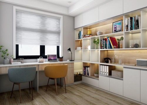 业主还没有计划要小孩,加上两人在家办公的时间比较多,好莱客设计师直接将次卧改成书房,满足两人在家工作的需求。靠窗位置打造一字型双人书桌,可容纳两个人同时工作,这样设计既保证了两人有独立的工作空间,交流起来又很方便。这里采光好,视野好,有助于缓解工作压力。