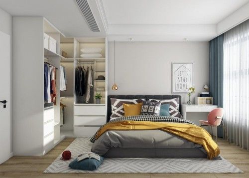 转角衣柜的打造体现了设计师的走心,大大提升空间利用率。开放式的设计,衣服一目了然,拿取更便捷。业主希望衣服都能挂起来,既不用叠衣服,又能避免衣服产生折痕,所以衣柜布局多为悬挂区。