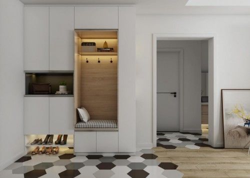 多功能玄关柜将鞋柜、换鞋凳、挂衣钩组合在一起,业主进门后直接就能换鞋、挂衣、放钥匙,很方便。鞋柜的中部特意留空来摆放装饰品,给玄关颜值加分。