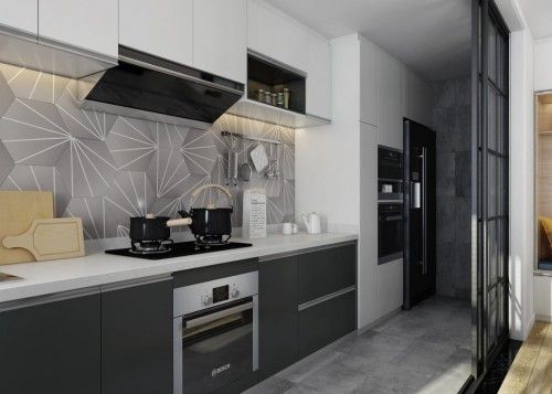 吧台后的厨房也经历了一番大改造,它的右边本来有个超鸡肋的杂物间,设计师索性打通了扩大厨房面积,提升业主做饭的舒适感。一字型的布局简单利索,左侧依次是清洗区、切配区、烹饪区和装盘区,右侧放置烤箱蒸箱一体定制柜,并嵌入了冰箱,完美解决业主家日常的烹饪需求。