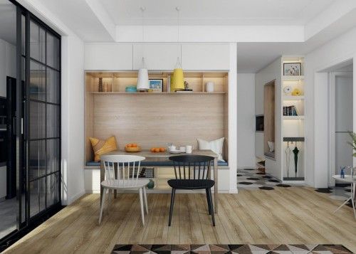 客餐厅的多功能区打造是整个空间的亮点,采用卡座+吊柜的整体家具,不仅节省空间,灵活性和舒适性都更强,可容纳更多人,非常适合业主用来会客、洽谈。如果觉得在房间里闷头工作没灵感,在这里办公也很舒适自在。另外,卡座底部和上方吊柜还能用于收纳,小小餐厅却集用餐、办公、会客、储物于一身。