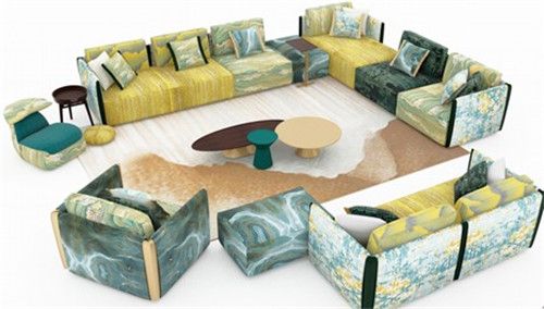 而作为千里江山系列的懒人布艺沙发“锦鲤”采用锦鲤的创意造型,不仅在寓意上戳中消费者追求“鲤鱼跃龙门”的美好寓意,“萌态”十足的鲤鱼体型和前后翻动的鱼尾还能够满足坐姿和躺姿的不同需求,具有很高的实用性。此外,还有花色各异的绣墩,也提取了《千里江山图》中山形、海天、叠翠、大漠四种图案,富丽精巧,是“穿越后宫,奉茶赐坐”的不二选择。
