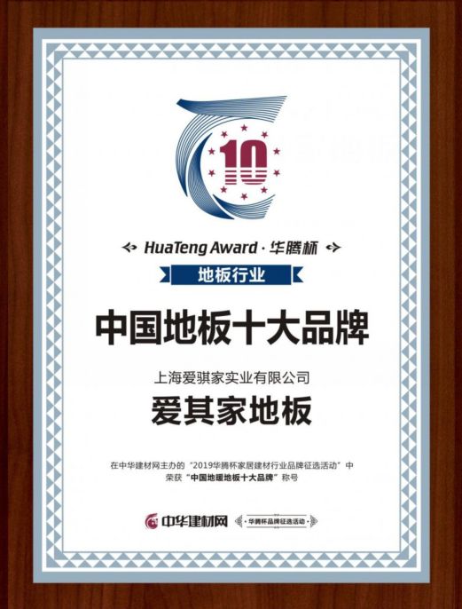 由中华建材网重磅推出的中国地板十大品牌网络评选活动,得到了各界人士的高度关注,众多品牌踊跃报名,不仅有大家耳熟能详的一线品牌,还有不少实力精英以及新兴黑马的参与,众多企业竞相角逐,场面异常火爆,盛况空前。最终,经过三个月的层层选拔,爱其家地板一路过关斩将,从众多实力品牌中脱颖而出,荣获2019年华腾杯“中国地暖地板十大品牌”奖项。