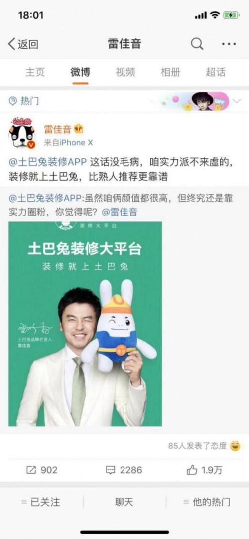 今年7月,土巴兔正式宣布雷佳音成为其品牌新代言人。这次时隔四年的新变化伴随着品牌理念的升级,新增一句“比熟人推荐更靠谱”,如何让这句非常口语化的理念快速被消费者记住,输出土巴兔的互联网家装领导者地位,土巴兔在广告投放上也颇费心思。土巴兔首先是找来了最当红的实力派男演员,有着国民萌叔之称的雷佳音作为品牌新代言人,更在广告投放上走起了立体环绕沉浸式的高级重复式“播报”。在官宣代言的微博平台上雷佳音转发土巴兔官方微博时将”装修就上土巴兔,比熟人推荐更靠谱”加在了微博文案中,雷佳音千万级微博粉丝,加上雷佳音工作室和粉丝的联动扩散,已经是不小的影响力。