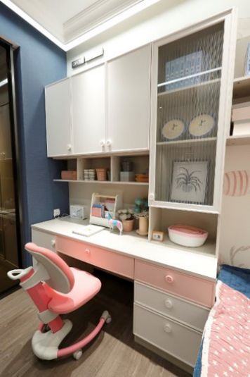 欧铂丽家居定制充分考虑到儿童心理特点,超大书桌搭配书柜,形成专门的学习区域。童趣满满的书柜非常适合启迪孩子的好奇心,而且书籍全部摆在房间醒目的地方,非常利于引起孩子的注意,她可能随时拿起一本书翻看,慢慢就会爱上阅读。