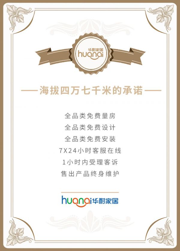 在鱼龙混杂、服务能力良莠不齐的家居建材行业,26年里,华耐家居不断自我迭代刷新着行业的服务标准:行业首推出全品类免费量房、全品类免费设计、全品类免费安装、7x24小时客服在线、1小时内受理客诉、售出产品终身维护的六大服务承诺。在六大承诺的背后,凝结着华耐家居26年服务经验提炼的核心产业服务供应链。