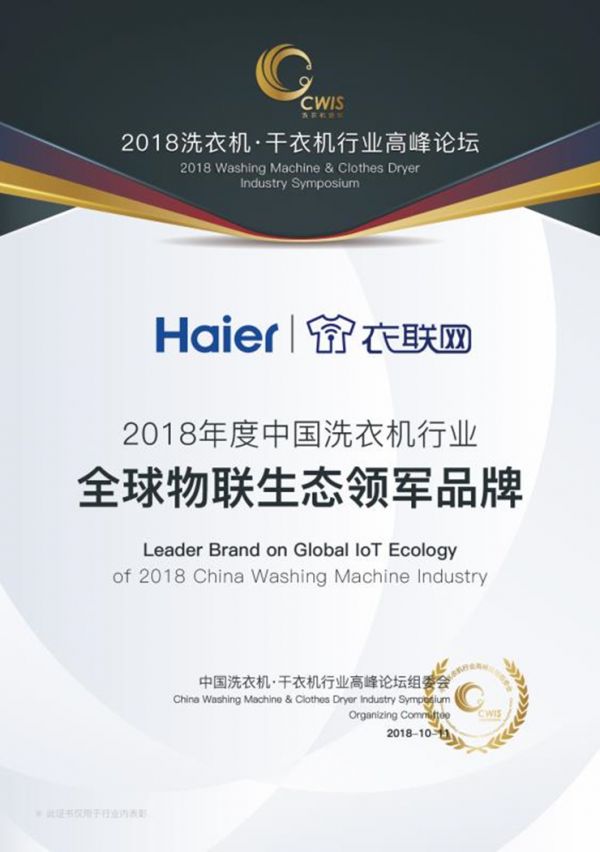 9月25日,“2019中国洗衣机干衣机行业高峰论坛”在天津召开,海尔衣联网荣获物联网场景生态突出贡献奖。作为全球首个衣联网生态平台,在“智家云”的战略布局下,海尔洗衣机基于智慧网器,搭建生态平台,为用户提供智慧阳台、智慧衣帽间等不同场景的洗护解决方案,实现由网器到场景到生态的升级。