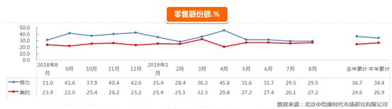 2019冷年空调市场量额齐跌,进入2020新冷年后,空调市场竞争加剧。从2020新冷年开盘的第一个月,中怡康8月数据显示,从零售量看,美的空调份额27.2%,格力份额24.4%,美的反超格力。从零售额看,格力空调29.48%,美的空调27.24%,格力领先美的,双方难分伯仲。同样,不擅营销的海尔空调却在北京、青岛等12区域实现反超,成为第一名。