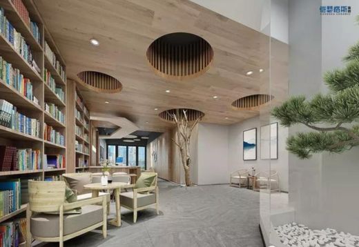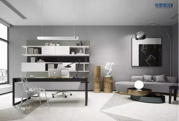 釉面的质感效果加上砖面纹理设计似动似静,犹如身处乞力马扎罗的雪峰中银白晶莹,赋予空间一种静下来的沉稳理性气质,搭配木制的座椅和书柜,给空间带来几分艺术气息。再相应搭配简单的绿植恰好的注入一缕灵动气息。