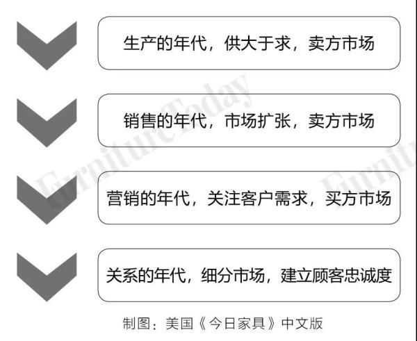 美国家具业的渠道演变大概分为生产的年代、销售的年代、营销的年代以及关系的年代。