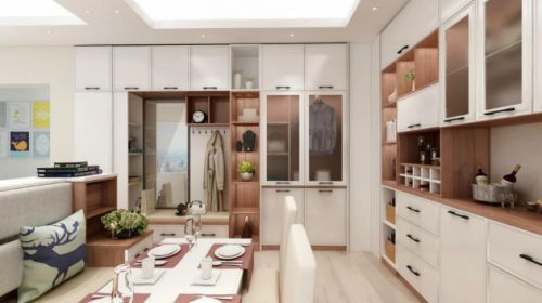 ▲合理规划门厅格局,充分考虑陈先生一家四口的实际需求,玄关在保证美观、便捷的同时设置大量橱柜,做足收纳“内功”。开放式餐厨一体空间既能最大限度地为客厅节省了空间,给宝宝们更多的玩耍空间,又方便徐女士在烹饪时随时照看宝宝。