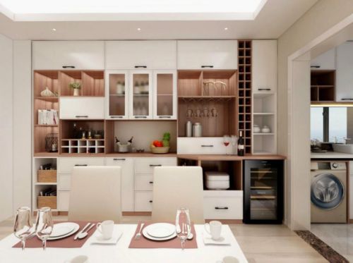 ▲重新定义餐厅空间的功能属性,创新规划就餐区、收纳区、装饰功能区,注重功能体验与视觉观感。尤其是简易线条和棕、白、黑等纯色的合理搭配,目之所及,整洁精简,大大提升了用餐的格调,营造淡雅、温暖的氛围。