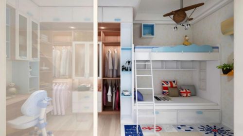 ▲俩宝住一间,是绝大多数二孩家庭的选择。如何有效规划空间最为重要。高低床“嵌入”衣橱,既解决了孩子们独立休息空间和衣物存放的问题,也最大限度地节省空间,给孩子们营造更大的游戏空间。不过,高低床虽然是二孩家庭的“法宝”,但在选择时要注意选择明亮、单一的色彩,比如白与蓝就是最佳CP;同时要考虑房屋的层高问题,以免上铺空间太局促。