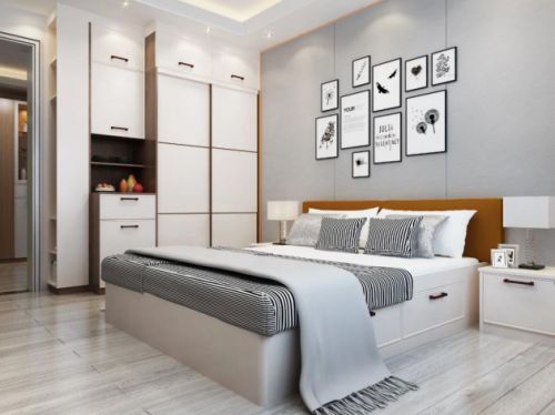 ▲卧室延续客厅简约、淡雅的装修风格,拒绝婚纱照庸俗上墙。顶天立地大衣橱,满足四口之家的衣物收纳,设计师良苦用心,连衣橱的侧面都不放过,设计了储物格。
