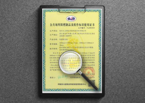 答:大王椰阻燃板获得了由国家防火建筑材料质量监督检测中心颁发的《公共场所阻燃制品及组件标识使用证书》认证,证书中标出,大王椰阻燃板阻燃性能均达到GB20286-2006规定的难燃B1级,已被授权可在包装上使用证书规定的阻燃制品标识。
