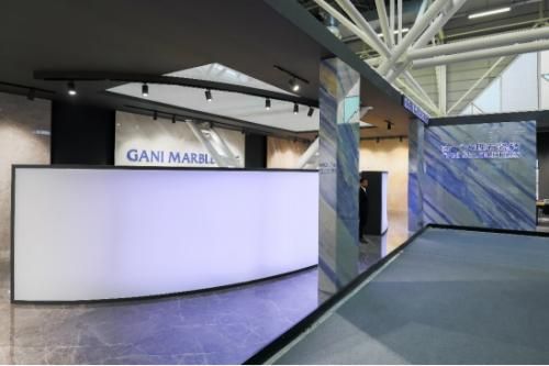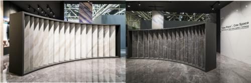 本届展位由首席设计师Stefano Trovato及其团队倾情打造,“过渡和渐变之美”为设计研究主题,同时拟通过设计展示我们产品的力量。以弧形灯墙打造“渐变”入口,将背部两款产品融合在一起。随着脚步的移动,我们可以完成从白色产品到深色产品完整纹路的过渡。巧妙的视觉体验,为设计师在不同选材及应用的配合上提供灵感。