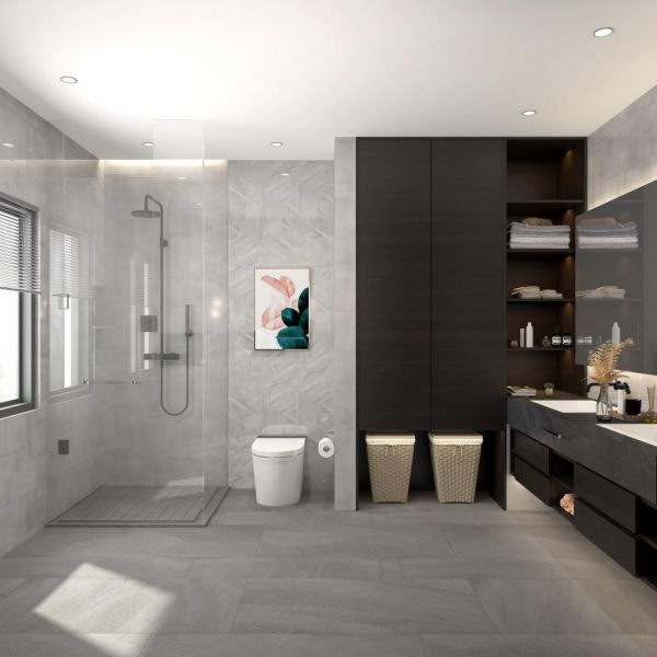 在规格上,箭牌瓷砖——古奇灰,突破常规,匠心打造600X1200mm大规格的瓷砖,使整个瓷砖可随意切割成多种时尚规格,令空间大小不再局限,让卫浴空间打造出更多可能性,甚至无论上墙下地都能在空间视觉上,充分展示瓷砖纹理的真实延伸感。