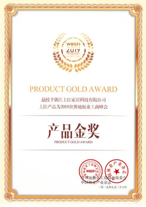 此外,峰会还授予上臣产品为“2019世界地板业工商峰会产品金奖”,这也标志着上臣的产品得到了行业的高度认可,是对上臣人不忘初心的表彰。