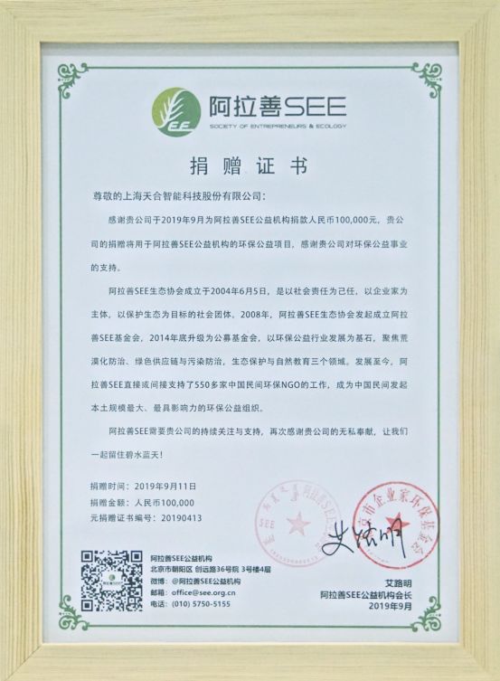 近日,天合智能很荣幸地收到来自于阿拉善SEE公益机构的捐赠证书,对我们来说,这是一种莫大的鼓励,也是对本次公益活动取得显著成效的见证,离不开每一位客户的支持与配合。