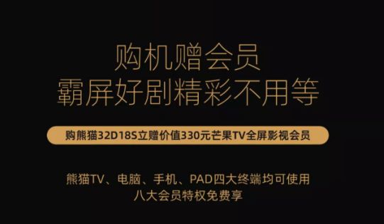 更重要的是,购买熊猫32D18S还赠一年的芒果TV全屏影视会员,价值330元。除了电视端外,电脑、手机、PAD终端也可以同时享受跳过广告、热剧抢先看、综艺独播、节目周边、会员片库、专享缓存、赠送观影券、蓝光画质这八大会员特权。