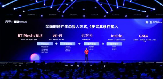 在硬件生态接入方式上,天猫精灵拥有蓝牙Mesh/BLE、WI-F、云云对接等多种,语音接入从inside/sdk到GMA全部支持,而且4步就可以完成硬件接入,照明电工、大小家电等品类最快一周就可以接入。