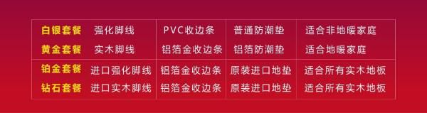 为了帮您搭配选购的木地板,金钢铂林还为您准备一套辅料套餐。凡在活动期间在门店购买木地板的用户,都可以加价对辅料进行升级,升级套餐如下。
