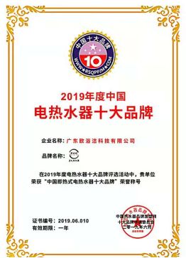 欧浴洁科技有限公司荣获2019年度中国电热水器十大品牌