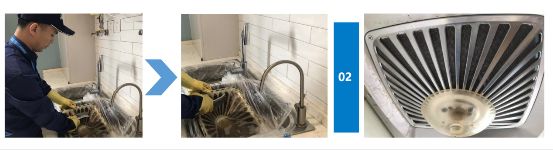油烟治理前,技师先对吸油烟机进行了环机、安全性能、治理前风速检测。结果显示,吸油烟机主要存在油网过久没有清洗、烟管老旧两个问题。技师提出更换风管和清理油网的方案,得到刘女士首肯后,便把滤网、网罩放入提前准备好的水槽保护袋内,再倒入一包60克油网保养粉,用60℃以上的热水将油网浸泡15分钟,接着进行清洗,清洗后的油网可以说是焕然一新。