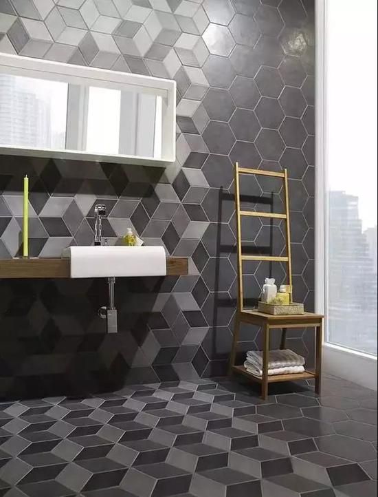 将六角形分割成3个菱形方块,采用深浅不一的灰阶色调,在视觉上构成立体感,相当具有摩登风范!