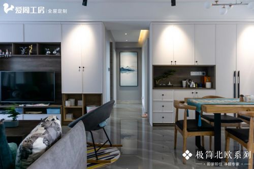 下面这套房的设计灵感来自于现代人对田园生活的向往,循规蹈矩的生活成为了这座喧嚣城市中忙碌的常态,但其实现代人都渴望兑现自己心中的湖居理想:临江而居,坐享江中美景,晨起看碧水蓝天,夜幕观灯火通明,闲暇漫游亲水步道,忙时任江风洗去疲惫。 为此设计师围绕业主的生活方式,了解业主对工作、生活和娱乐等新生活的追求,以负氧离子净醛板为柜体板,分解甲醛,净化空气,祛除异味,为业主带来阳光、休闲和健康的居住体验。