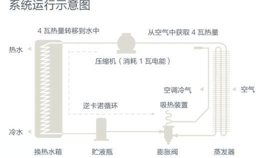 这是一种基于逆卡诺循环原理建立起来的节能、环保制热技术。通过自然能(空气蓄热)空获取低温热源,经系统高效集热整合后成为高温热源,用来供暖或供应生活热水,整个系统集热效率甚高。