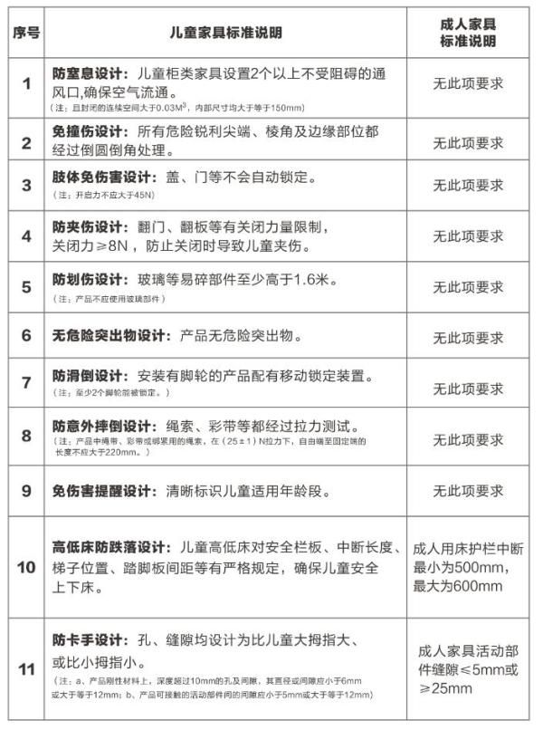 需要注意的是,儿童家具不同与成年人家具,儿童家具标准比成年人家具标准更严格。如下图所示,儿童家具标准中对砷、锑、钡、硒和领苯二甲酸醋等都有明确的规定,而成人家具标准则无此项要求,即使在游离甲醛限量方面,儿童家具标准要求也高于成人家具标准数倍。
