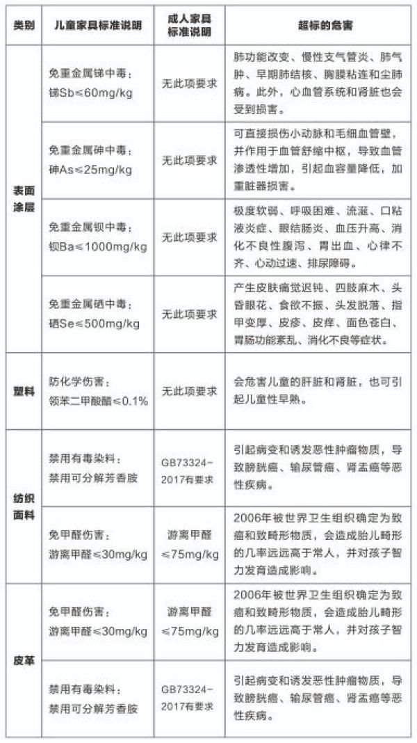 儿童抵抗力较差,家具中有害物质对儿童危害非常大。除甲醛外,儿童家具表面涂层的用料中的重金属亦会对儿童造成伤害,如锑元素超标,使用者很可能出现高热、昏迷、头痛、呕吐、烦躁、痉挛等,严重者出现腹腔积液、肝昏迷,甚至死亡。