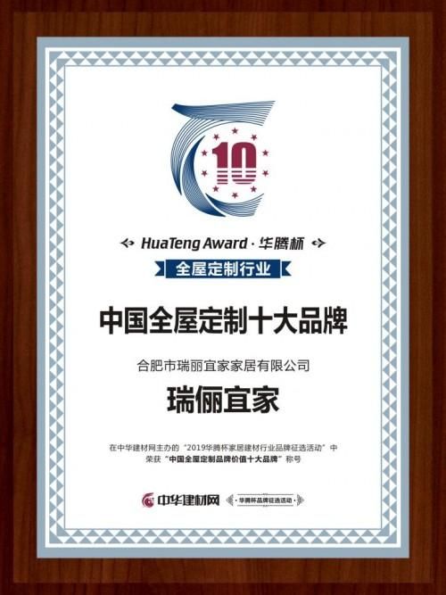 热烈祝贺瑞丽宜家荣获2019中国全屋定制品牌价值十大品牌