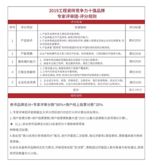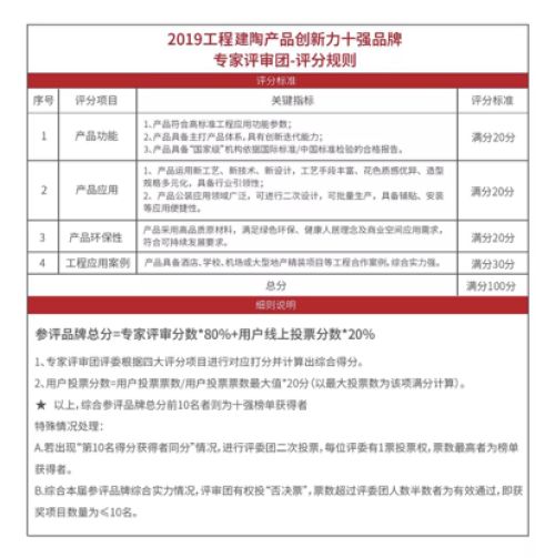 ◆2019工程建陶产品创新力十强品牌(≤10名)考量企业产品在产品功能、产品应用、产品环保性及工程应用案例等综合实力。