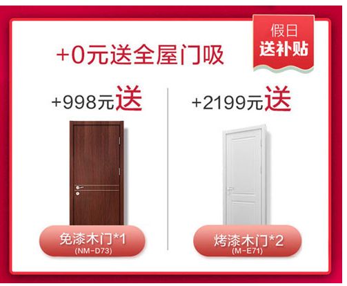 购买索菲亚木门的同时衣柜货款满10000元或购买整套橱柜产品,+0元送全屋门吸,+998元就送一樘简约免漆木门,或者+2199元就送两樘时尚烤漆木门。