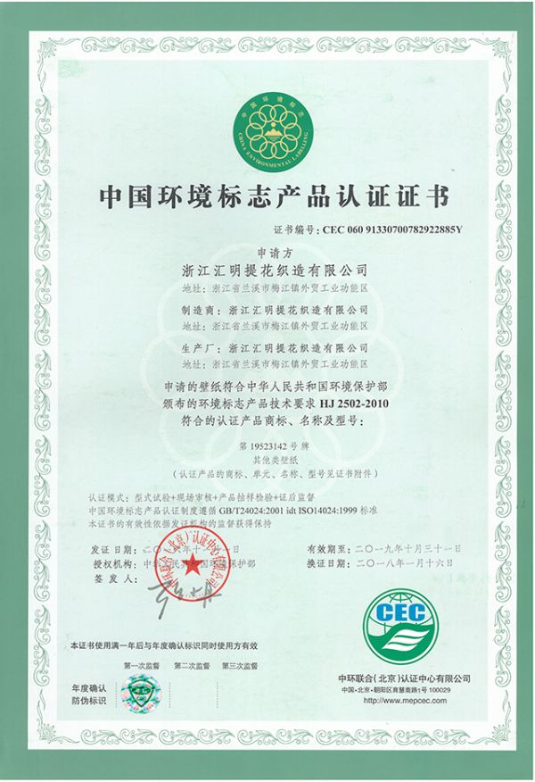 “十环认证”要求产品从生产到成品的每一道工序都满足无毒、无害的条件,是我国最为严苛的环保标准。汇明A+墙布以为消费者提供舒适、健康的居住环境为己任,从源头开始层层把控,以服装面料标准织造墙布,21到品质工序打造不含工业氨水、零重金属、零APEO的环保墙布。通过“十环认证”,是汇明A+墙布产品环保、健康的最佳证明。