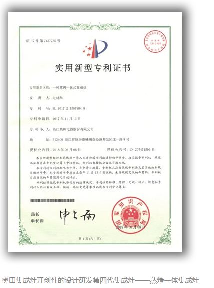 奥田突破行业技术壁垒,开创性的设计研发第四代集成灶——蒸烤一体集成灶,成为首家拥有蒸烤一体
