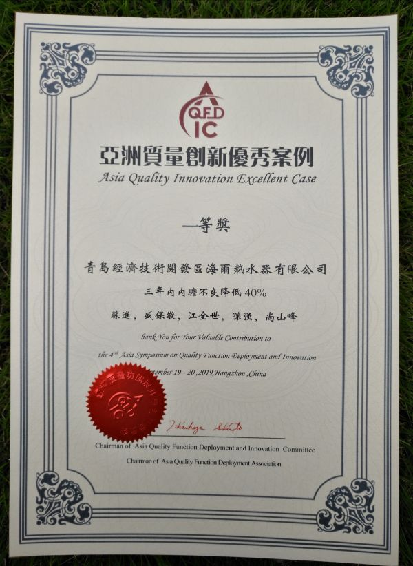 在2019年举行的亚洲质量创新奖中,海尔热水器以“三年内内胆不良降低40%”的创新项目获得亚洲质量创新奖,成为热水器行业唯一的获奖品牌。