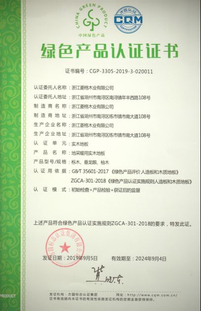根据国务院办公厅出台的《关于建立统一的绿色产品标准、认证、标识体系的意见》文件精神,近期浙江菱格木业有限公司(旗下品牌名称:天格地暖实木地板)于认证目录(第一批)中率先通过绿色产品认证,获颁《绿色产品认证证书》。