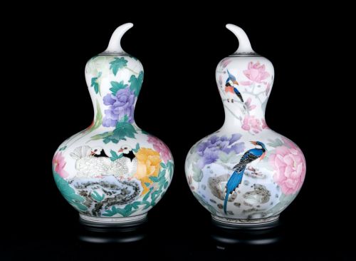 其中最具代表性的当属中国陶瓷艺术大师朱占平的《福禄满堂·锦绣欢歌》葫芦对瓶,采用醴陵釉下五彩瓷烧制技艺,在1380℃的高温中,实现了金与火、木与土的完美契合,画面在釉下永久定格。该作品瓶身为葫芦造型,葫芦谐音“福禄”,且器形像“吉”字,故又名“大吉瓶”,寓意大吉大利;和平鸽代表中国,象征盛世中国与世界共融、共和、共享的寓意;瓶身牡丹为盛世富贵之花,代表祖国走向富强之路;荷花,代表和谐盛世,也代表中国人民爱好和平;绶带鸟因有“寿”字,又绘制在葫芦上,称作“福寿双全”,瓶身又有如意组成图案,称为“福寿如意”。所以它不仅仅是一件艺术品,还是一件富有时代意义的国瓷重器。