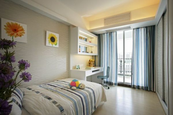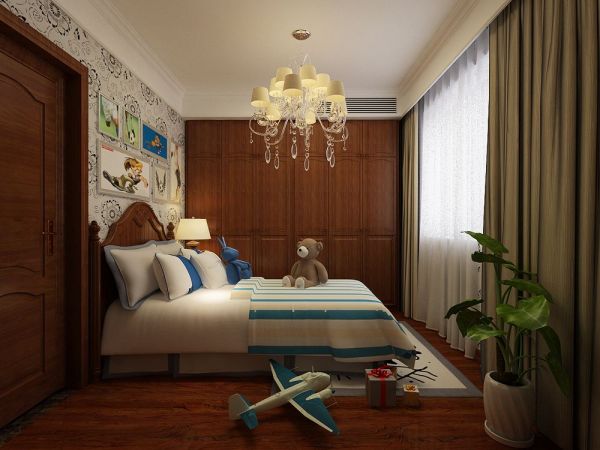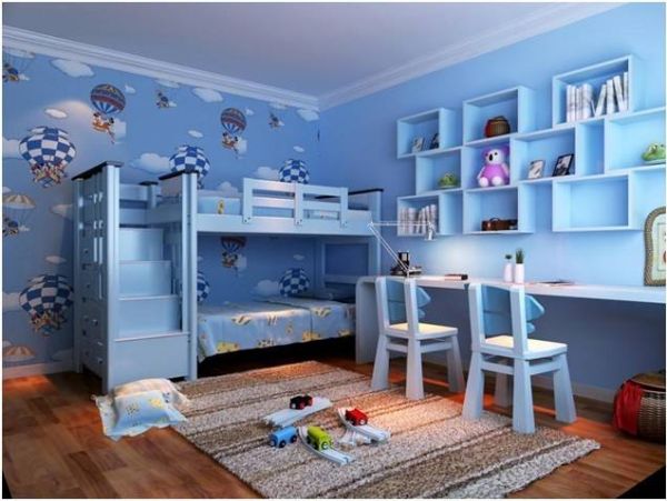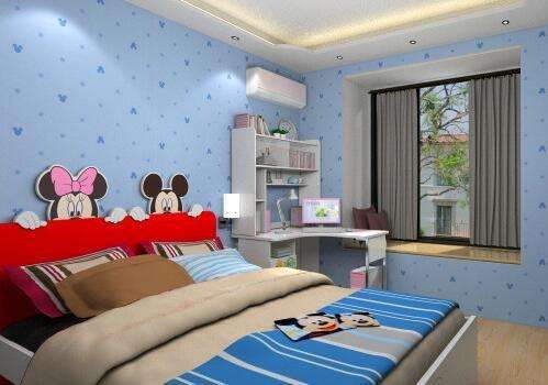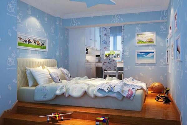 这款儿童房通过蓝色壁纸进行打造,这种装饰手法是较为简单快捷的设计方法,而纯蓝色的壁纸可能不够美观,如果在壁纸上加些卡通,再配套一些家具,那么整个儿童房的蓝色效果会非常更加好看。